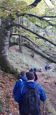 Y llegamos al inicio de la subida a la senda Alleko, que nos llevará al corazón del bosque. Al comenzar la subida se abren unos grandes claros en el cielo. Las 13h. Justo lo que decían las previsiones de Euskalmet. El solecito nos ha acompañado durante el resto de la ruta, haciendo del día una experiencia de lo más agradable. Debe de ser que comienza el veranillo de San Martín.