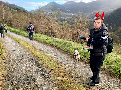Para la salida de diciembre a Sandra se la ha ocurrido que podíamos llevar un detalle navideño. Por eso de nuestras mochilas, txamarras, orejas y cabezas hoy han colgado pequeños (o no tan pequeños) trocitos de navidad. Hasta Popol llevaba colgando unas estrellas del alumbrado de la Avenida de la Libertad, que la borrasca de la semana pasada tiró al suelo. ¡Estaba guapísimo!